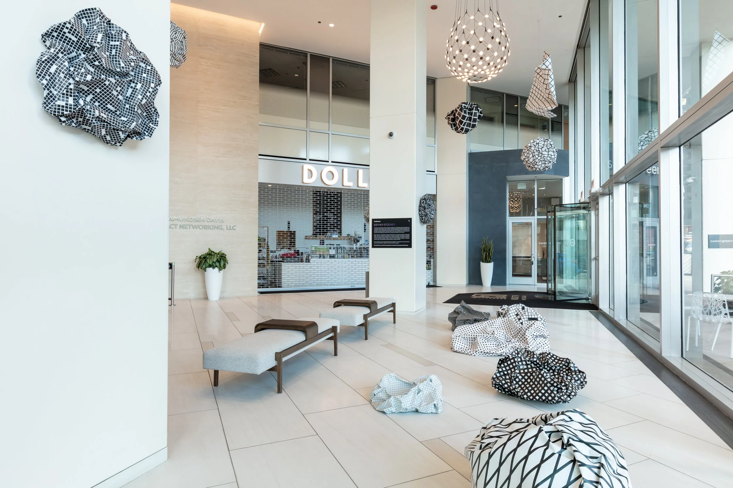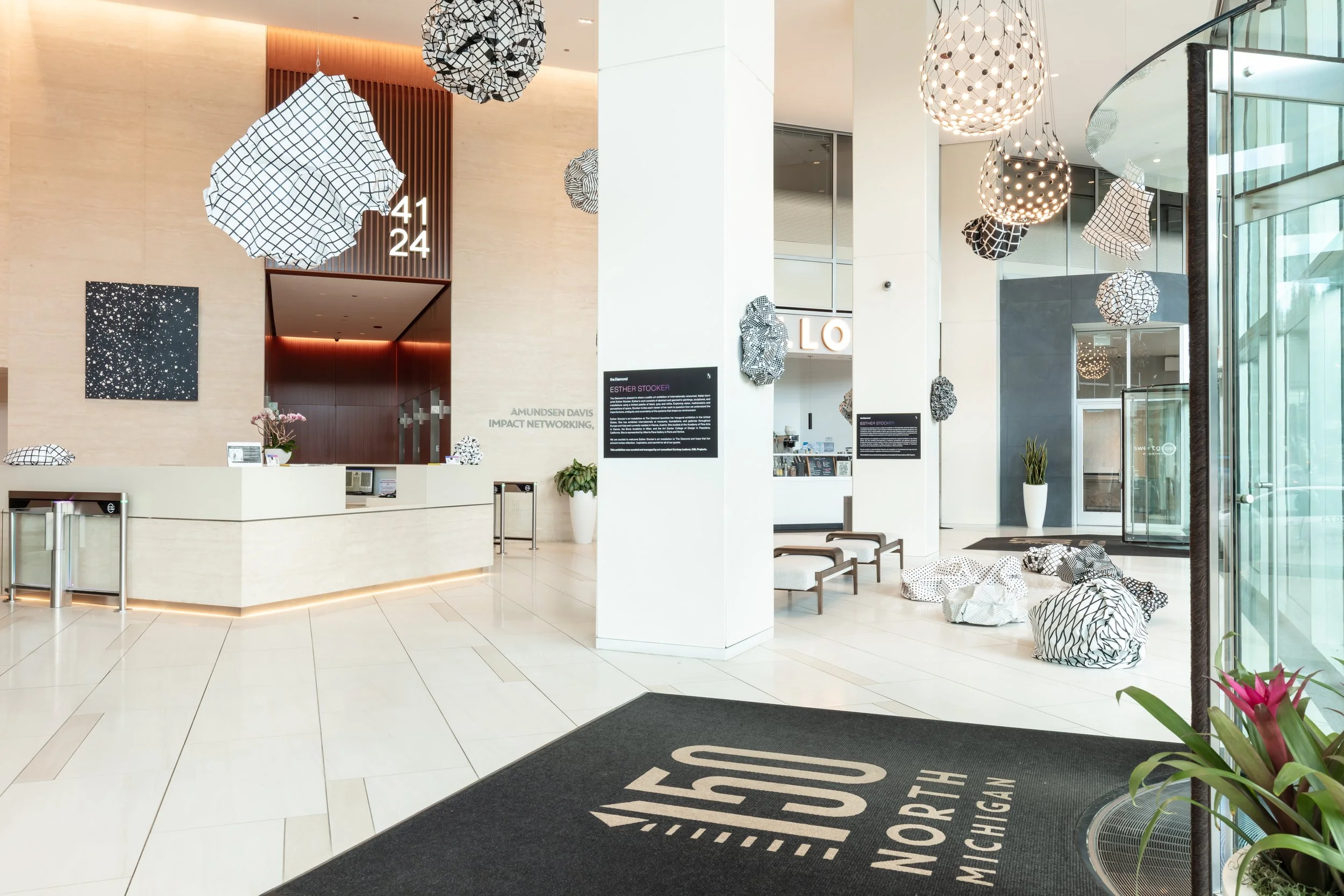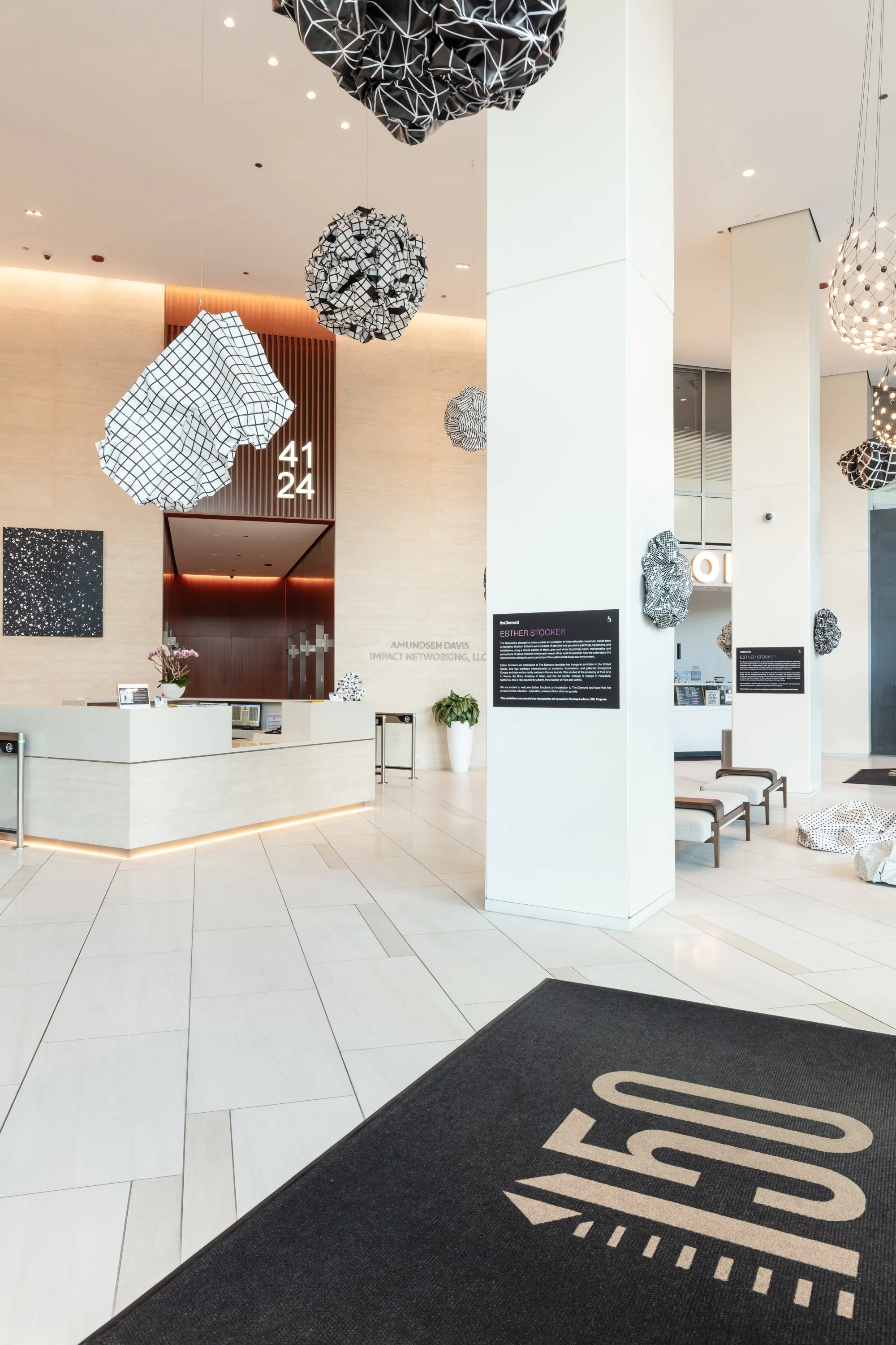 The Diamond (150 N Michigan Ave) is pleased to share a public art exhibition of internationally renowned, Italian-born artist Esther Stocker from April-November 2025. Esther’s work consists of abstract and geometric paintings, sculptures, and installations using a limited palette of black, grey and white. Playing with vision, mathematics and perceptions of space, she wants the viewer to question how we understand the imperfections, ambiguity and uncertainty of systems that shape our environment. Esther Stocker has exhibited internationally and currently resides in Vienna, Austria. She is represented by Alberta Pane Gallery in Paris and Venice. This exhibition was curated and managed by art consultant Cortney Lederer, CNL Projects.