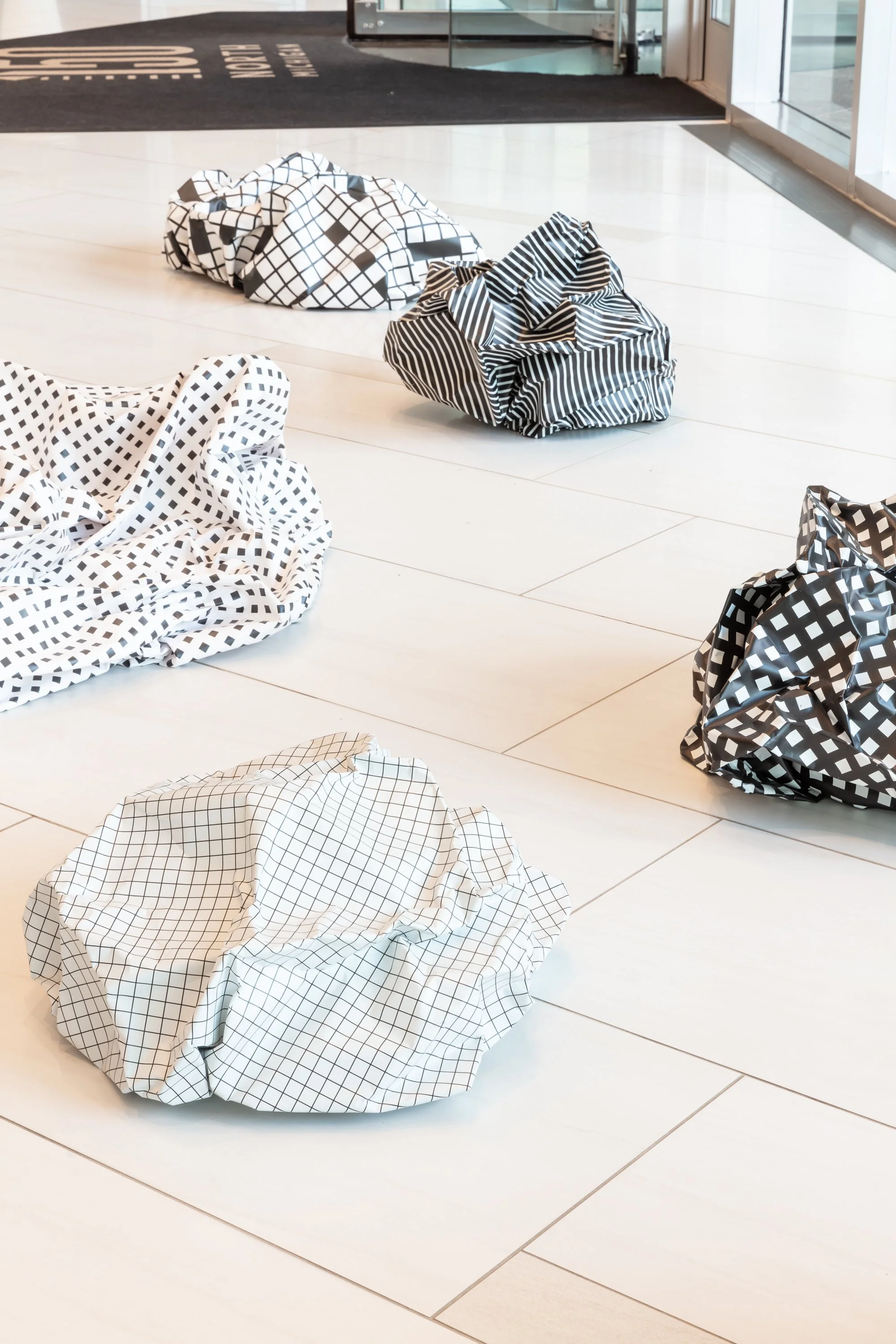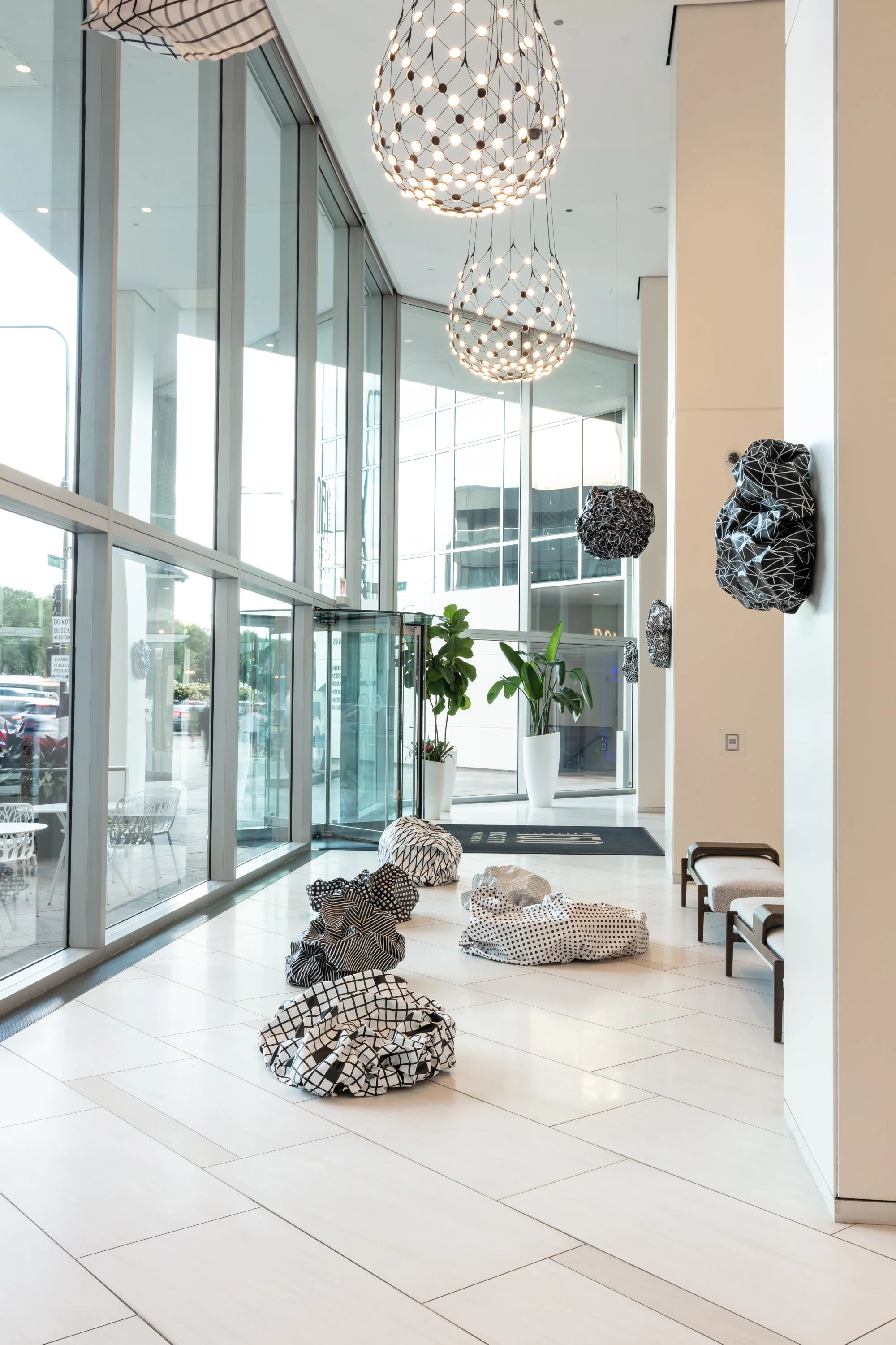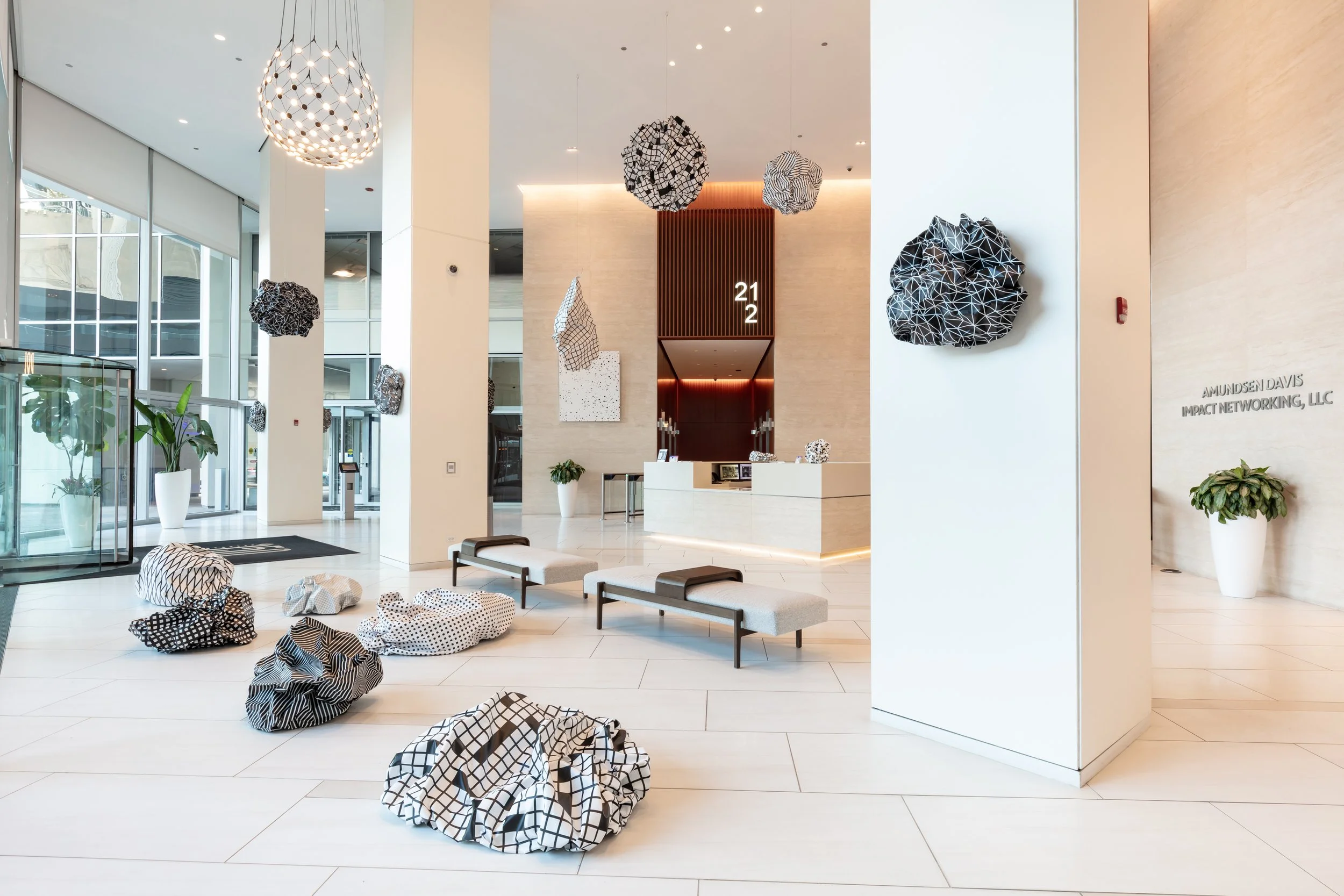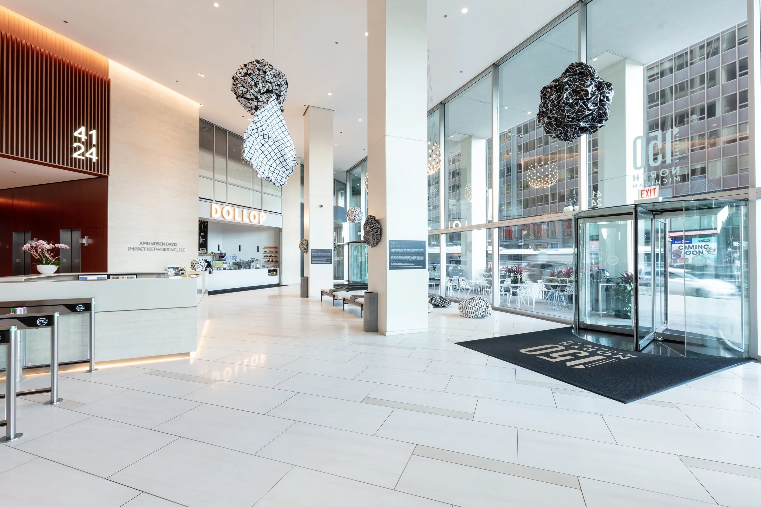 The Diamond (150 N Michigan Ave) is pleased to share a public art exhibition of internationally renowned, Italian-born artist Esther Stocker from April-November 2025. Esther’s work consists of abstract and geometric paintings, sculptures, and installations using a limited palette of black, grey and white. Playing with vision, mathematics and perceptions of space, she wants the viewer to question how we understand the imperfections, ambiguity and uncertainty of systems that shape our environment. Esther Stocker has exhibited internationally and currently resides in Vienna, Austria. She is represented by Alberta Pane Gallery in Paris and Venice. This exhibition was curated and managed by art consultant Cortney Lederer, CNL Projects.